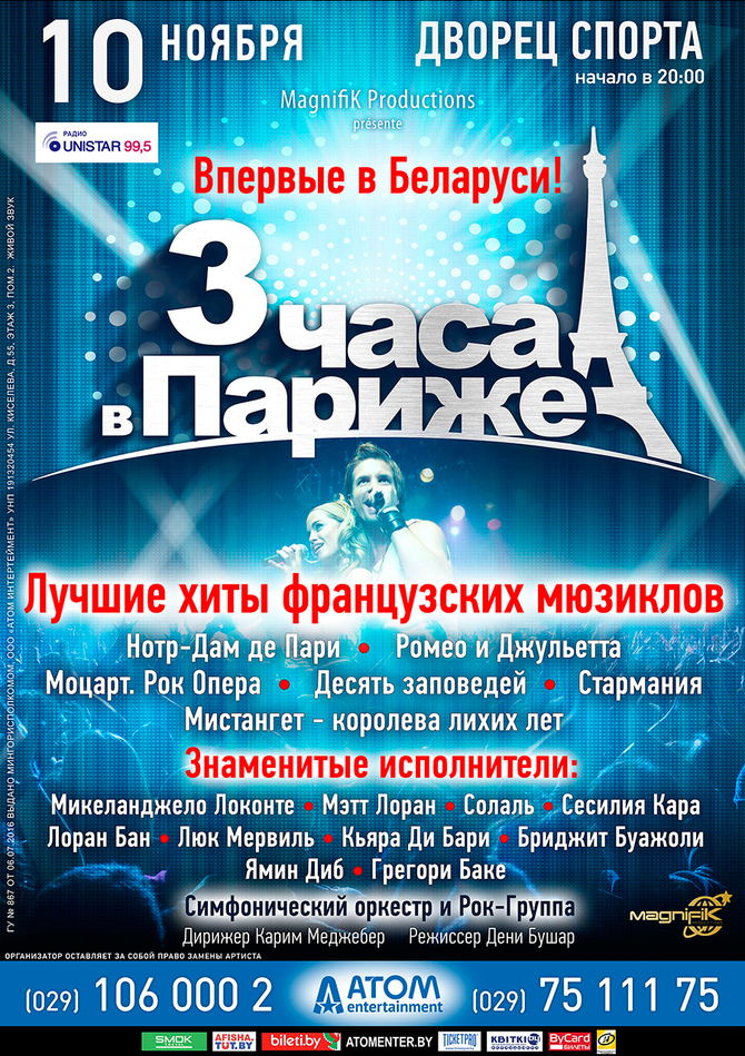 Пара, совершая пересадку в Париже, опаздывает на самолет и в ожидании следующего рейса решает прогуляться по городу любви. 3 часа в Париже становятся незабываемым приключением: на своем пути они встречают героев самых известных французских мюзиклов: Эсмеральду и Квазимодо, Ромео и Джульетту, Моцарта и Сальери, Козетту и Жана Вальжана и других. Такое же приключение – только во Дворце спорта – ждет минчан 10 ноября в рамках мировой премьеры шоу лучших хитов французских мюзиклов «3 часа в Париже».