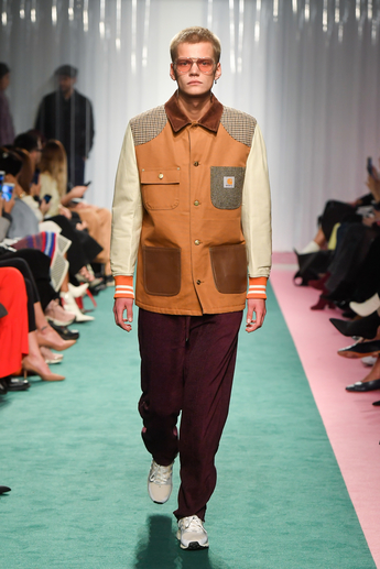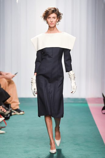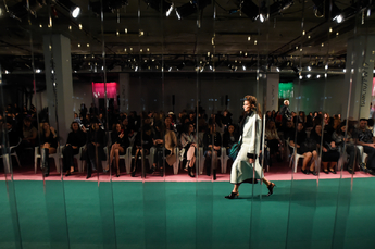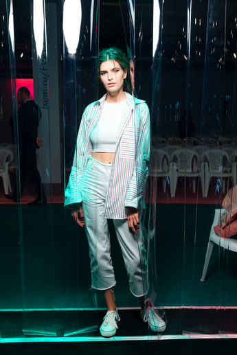 Специально для шоу, традиционно черное пространство пятого этажа ЦУМа в считанные дни перекрасили в белый цвет, а в оформлении использовали современные материалы, которые можно встретить как в моде, так и в строительной промышленности – различные виды пластика и цемент.