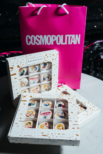 Никто из гостей не остался без сладкого комплимента от крупнейшей частной фабрики по производству пирожных макарон «Macaronika». Наборы пирожных с девятью изображенными на них стикерами Cosmopolitan для «ВКонтакте» - как приятное воспоминание о вечере.
