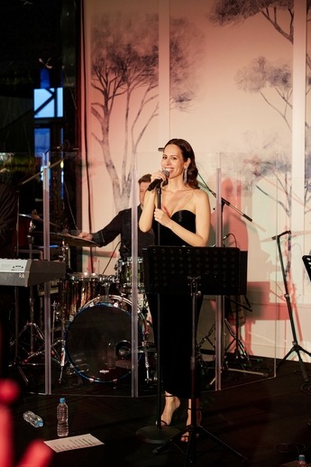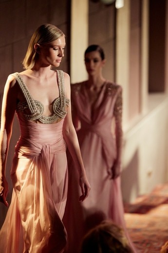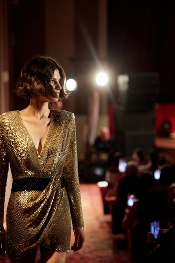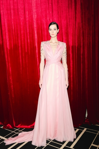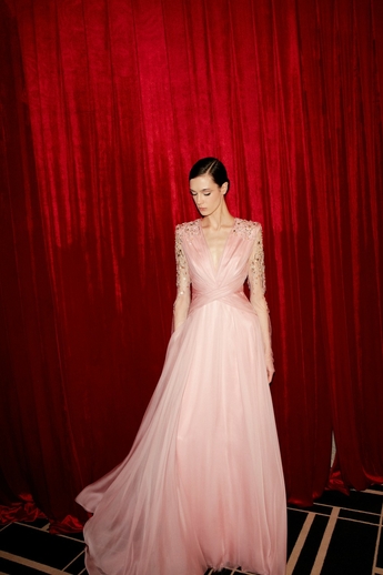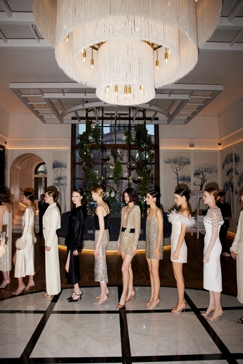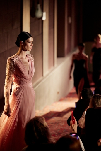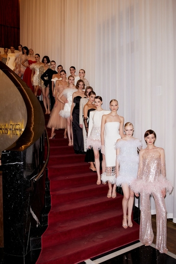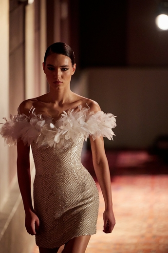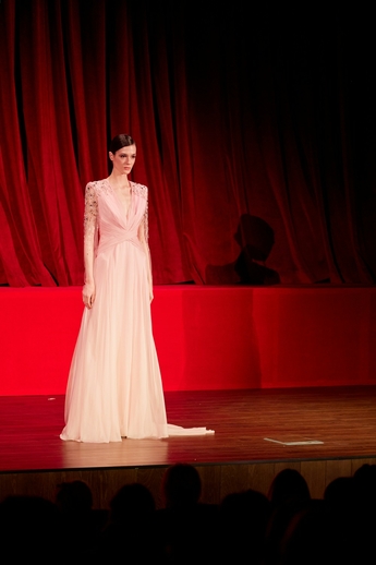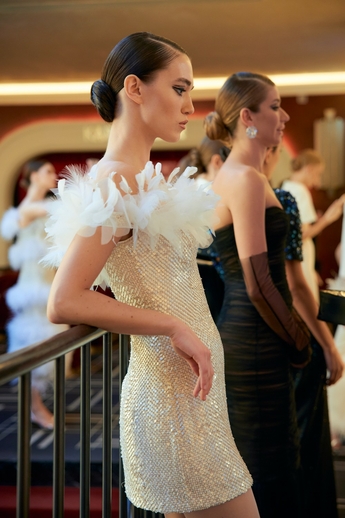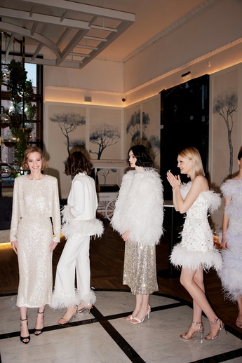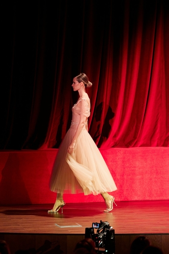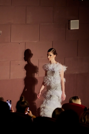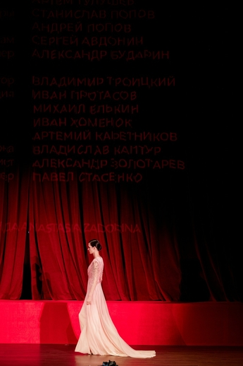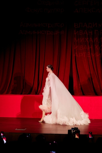В этот вечер большой зал «Художественного» превратился в импровизированный подиум и под звуки музыки 60-х на ковровую дорожку кинотеатра вышли модели. Fashion show было разделено на три истории: первая часть - элегантные и лаконичные образы в пастельных оттенках, за ними блестящие платья и костюмы, идеально подходящие для коктейльных вечеринок, а в финале появились яркие летящие вечерние платья, завершил показ костюм невесты из белоснежных кружевных цветов. Основные материалы коллекции - натуральные шелка разной плотности: итальянский шелковый шифон, шелковый жоржет, шелк-кади, гофрированный шелк и шелковое кружево, которое эксклюзивно создавалось для бренда в Швейцарии на производстве Schlaepfer. В коллекции много ручной вышивки с использованием сияющих австрийских кристаллов, французских пайеток, бисера и стекляруса. Еще одним ярким акцентом коллекции стали перья на рукавах, подолах платьев и манжетах жакетов - крайне женственный элемент образов.