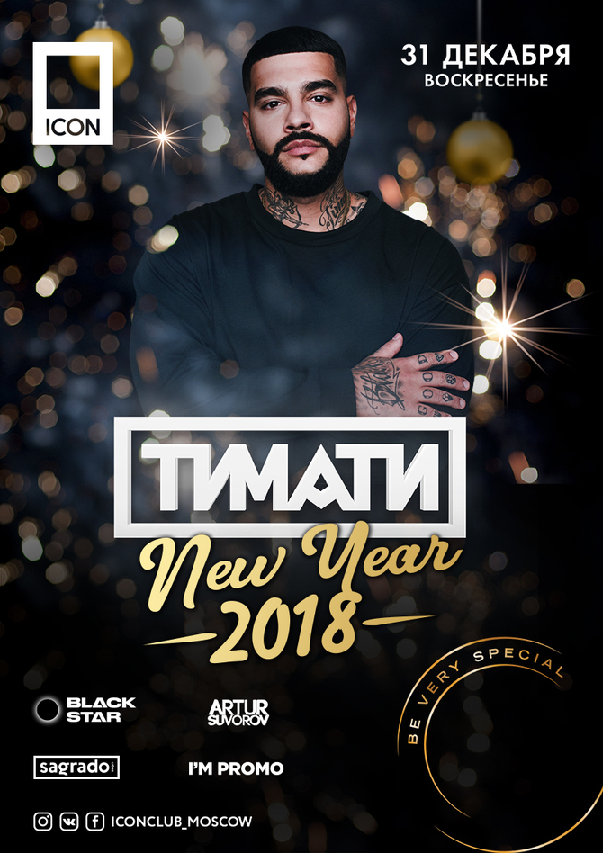 В Новый год — с любимым клубом. 31 декабря ICON готовит необыкновенный новогодний бал. Три зала — три настроения. Клуб гарантирует своим гостям невероятное путешествие во времени; от классической эпохи телевизионных «Голубых огоньков» до танцевальных ритмов завтрашнего дня. Хедлайнер новогодней ночи — самый востребованный рэп - исполнитель России, Тимати. Также в программе полуфиналистка телевизионного шоу «Голос» Мария Ероян и её кавер-группа Royal Drive. Happy New Year!